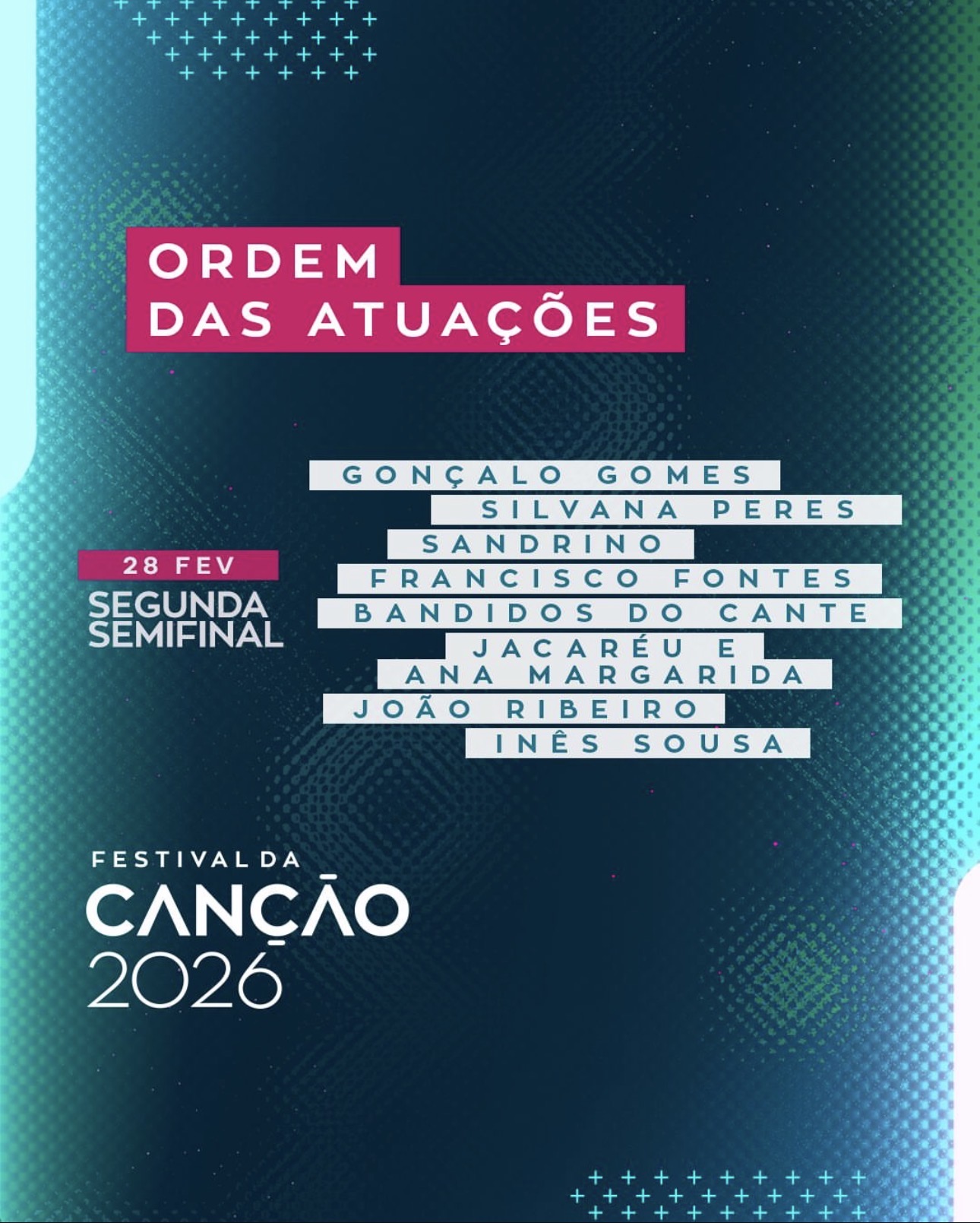 O Festival da Canção 2026 vai começar! A primeira Semifinal acontece já este sábado, a partir das 21h, com apresentação de Vasco Palmeirim, Catarina Maia e Alexandre Guimarães, em direto na RTP1, RTP Internacional, RTP África e RTP Play. Os oito primeiros intérpretes sobem ao palco do Festival da Canção, onde serão selecionadas 5 canções. Na segunda Semifinal, que acontece a 28 de fevereiro, serão apuradas as outras 5 canções para a Grande Final, a 7 de março.