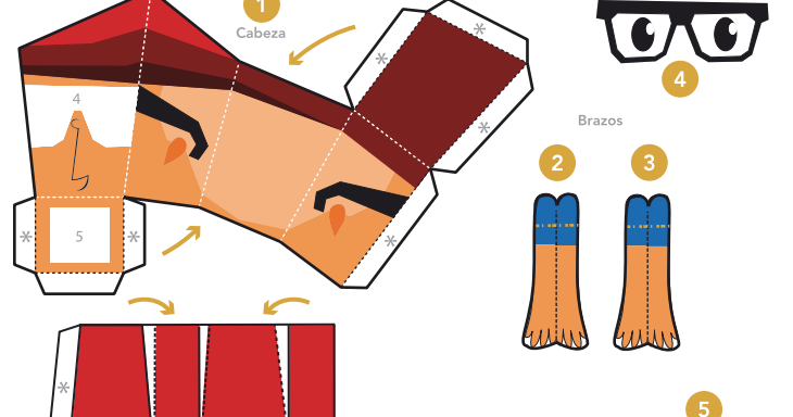Depois, recorta cada uma das peças pelas linhas mais grossas. Por fim, dobra e cola como indica o desenho, seguindo a ordem dos números.